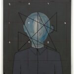 „A. O. Magic Square Face“ von Thomas Zipp (*1966) geht von seiner Auseinandersetzung mit dem mathematischen Modell der „Magic Square of Four“ aus, das Claude Fayette Bragdon (1866- 1946) in Higher Space Theorie (A Primer of HigherSpace) beschreibt. Die Abhandlung des amerikanischen Architekten, Autors und Theosophen befasst sich mit der vierten Dimension als ein Prinzip des Wachstums und der Veränderung von Zeit und Raum. Entstanden 1913 ist sie inspiriert von Einsteins spezieller Relativitätstheorie von 1905 und den Gedanken über das Raum-Zeit-Kontinuum. Zipps Malerei zeigt die Abstraktion eines menschlichen Kopfes hinter einer Graphik, die die Berechnung einer der möglichen Varianten des Magic Square of Four zeigt. Zipp arbeitet hier mit einer speziellen Form der Farbschichtung, die die unterschiedlichen Ebenen seiner Auseinandersetzung mit wissenschaftlichen Theorien widerspiegelt. Die Raster, die im Hintergrund des Bildes in verschiedenen Formen auftauchen und für den Versuch stehen, die Welt in mathematischen Modellen zu erschließen, stehen dabei im Kontrast zur abstrakten Form des menschlichen Kopfes im Zentrum.