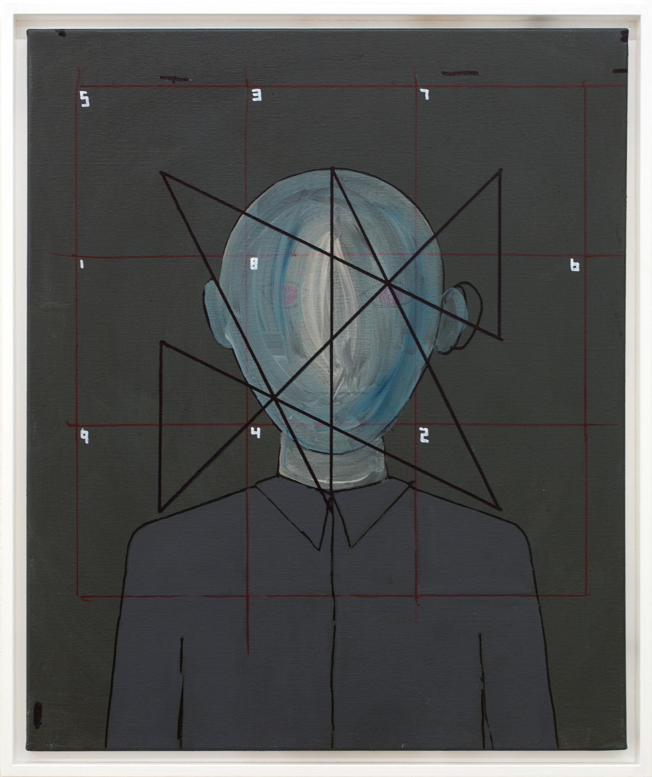 Zipps painting shows the abstraction of a human head behind of a diagram, which maps the calculation of one of the possible alternatives of the Magic Square of Four. Zipp is working with different techniques he brings together in a sort of layering, which also visualizes the different theoretical matters he integrates in his work. In the paintings background appear different types of grids, which, much in contrast with the abstract form of the human head in the centre, symbolize the human approach to scale phenomena in mathematical models.