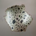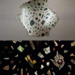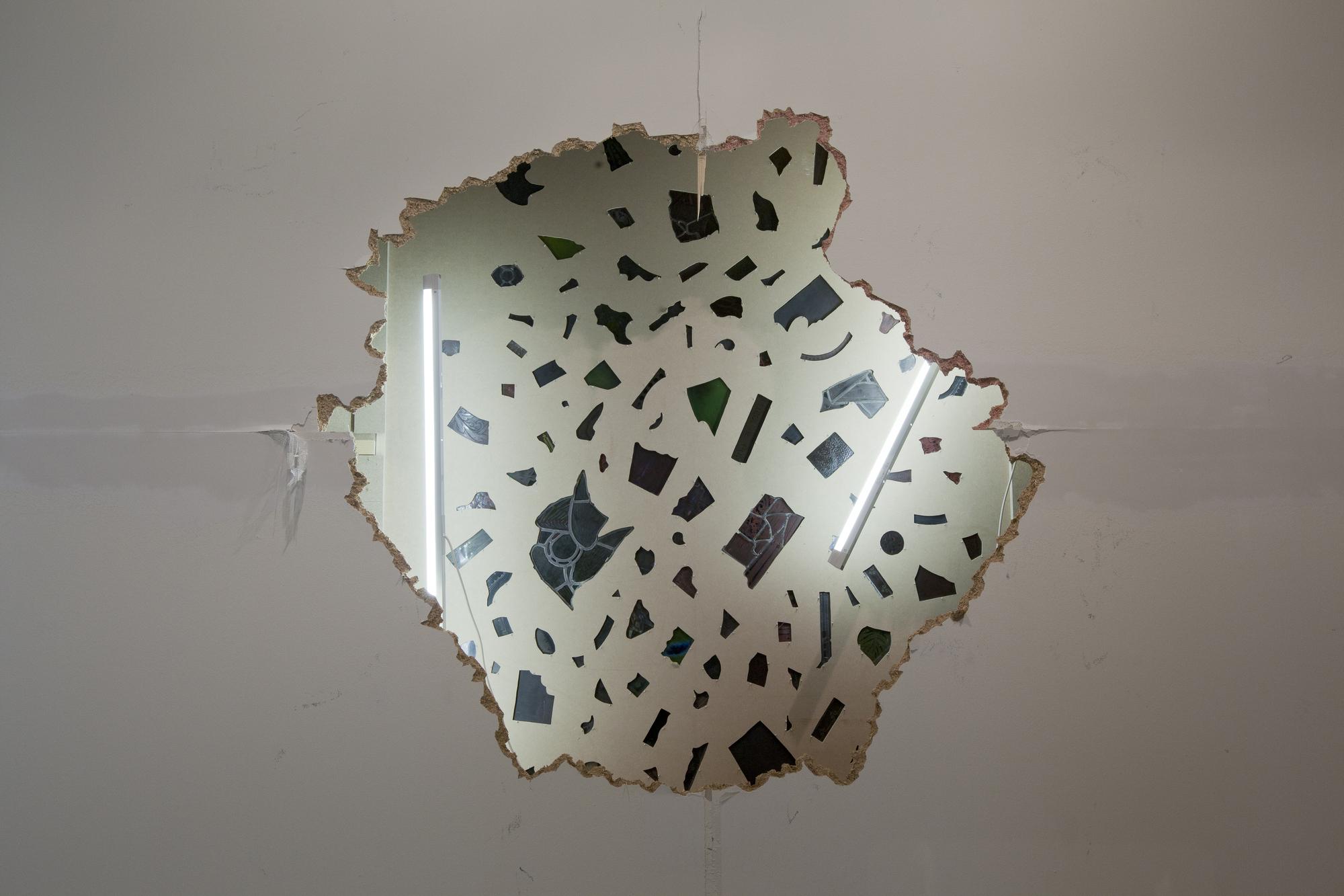 front: wood and neon tubes back: various broken stained glass window