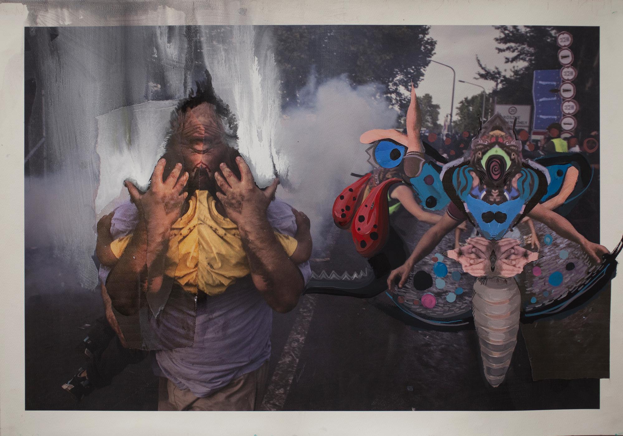 paper collage, acrylic, watercolor, ink, gesso and gouache on paper